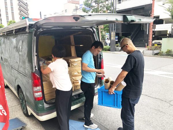 本日、あそび大学担当の方が千葉大学の学生と一緒に端材を引き取りに来ていただきました。