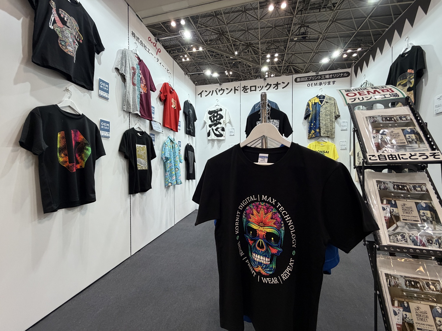 その中に来月導入予定のKornit社Atlas MAX POLYのサンプルも数点販売会社様よりお借りして展示しています。フルカラー3Dというこれまでには無い新しいプリント表現です。もう残り数時間となりましたが、うちのブースに是非お立ち寄りください。お待ちしてます!
