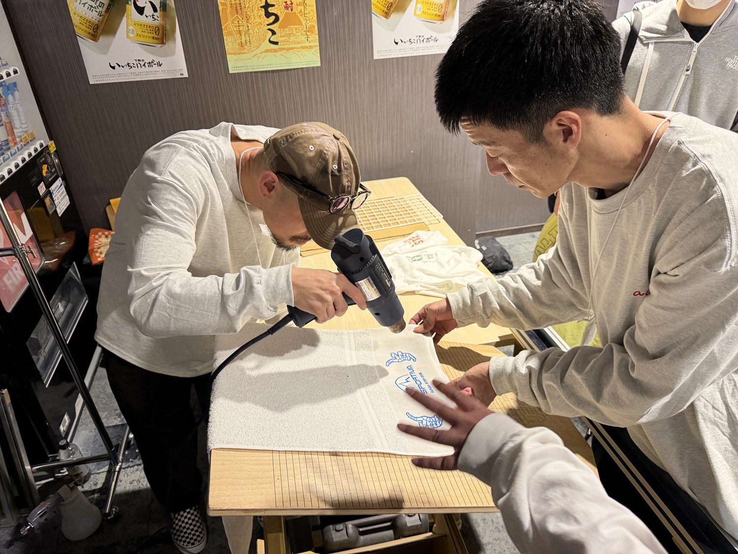 シルクスクリーン印刷の簡易設備でTシャツなどにお客様自らスキージーを持ってプリントしていただいてます。ADPの職人が丁寧に指導しているので、初めてのかたでもとりあえずなんとかなります。自分でプリントした商品は格別だと思います。皆さん楽しそうです。
