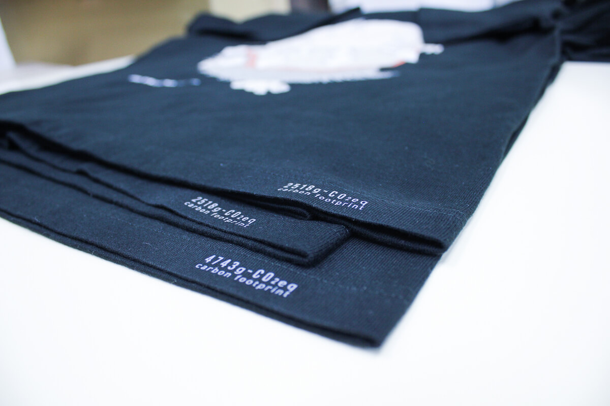 算出した数値は、単なるデータとして保管するだけではありません。製品の襟ネーム、Tシャツ本体の裾、下げ札などに明確に表示することで、エンドユーザー様の目に直接触れる形にしています。