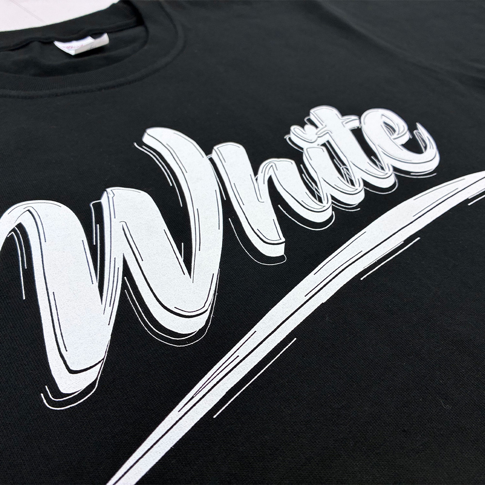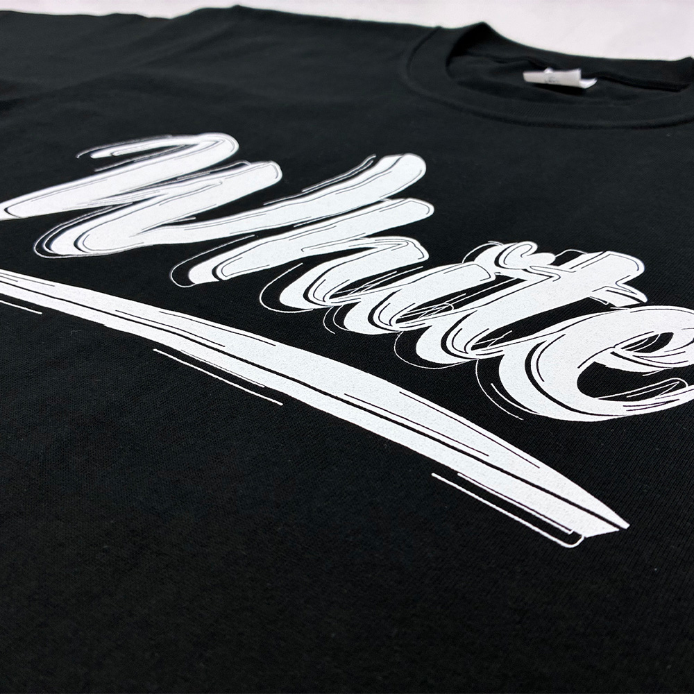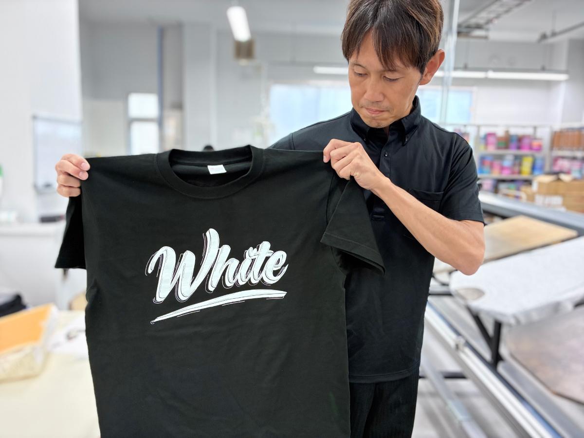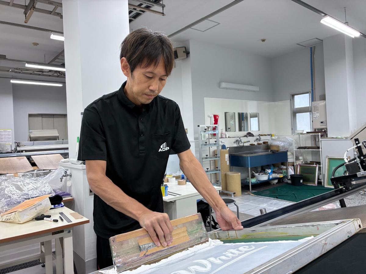 コーポレートカラーを忠実に再現するため、職人が手作業でインクを調色。また、黒い生地の上でも白が沈まないよう、下地に白を一度プリントしてからメインカラーを重ねる「アンダーベース」処理を施し、発色を最大限に高めています。