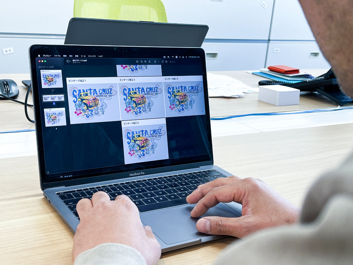 ノイズをかけたデータをインクジェットプリントすることで、インクが適度にかすれ、生地に馴染んだ「いい感じの古着感」を表現できます。ノーマルデータでそのままプリントするのとは異なり、意図的に中古感を加えることで、こなれた雰囲気を演出します。
