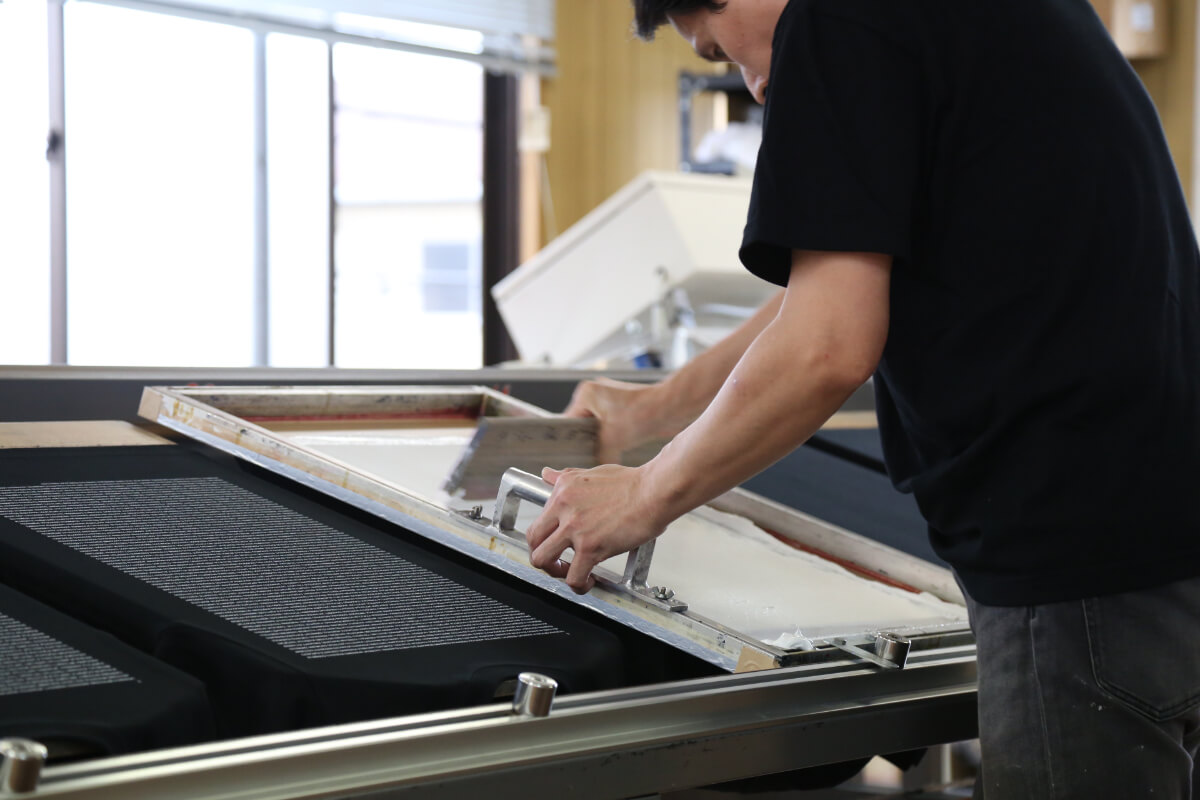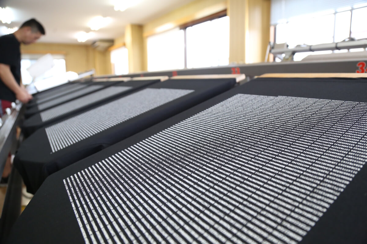 この50,000桁プリントは、工場長による極限までシビアな製版チェックと、熟練職人の繊細なスキージワークが完璧に噛み合って初めて実現できる、まさに「合作」です。
