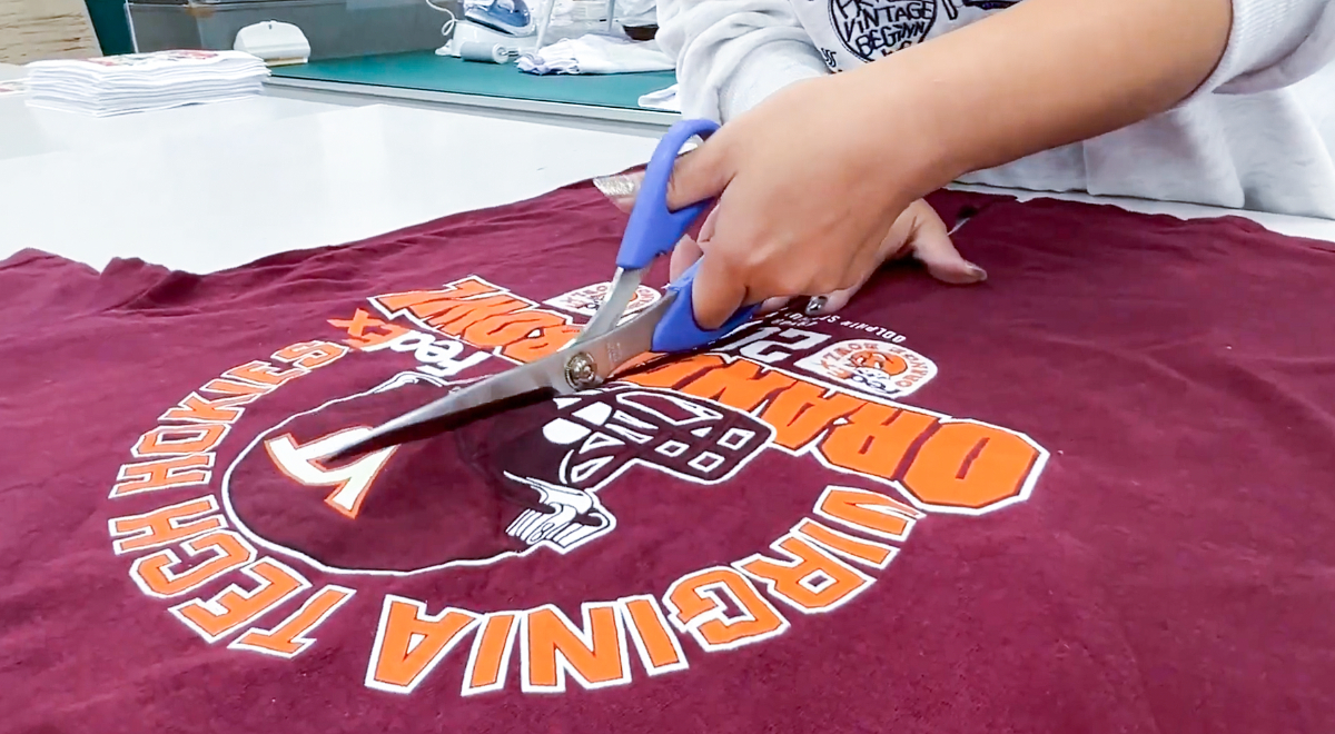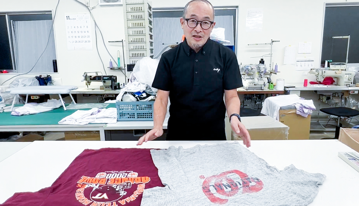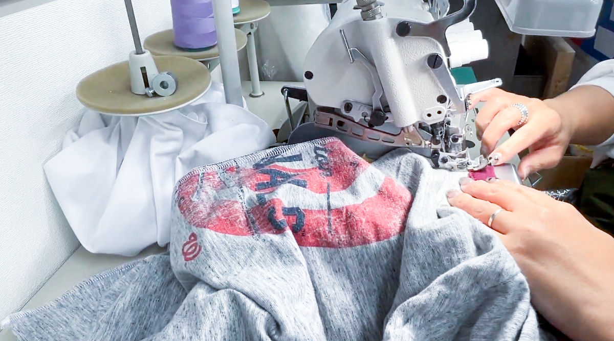 古着のTシャツを2枚用意し、それぞれをハサミで半分に裁断。異なるデザインの半分同士をミシンで縫い合わせることで、世界に一つだけのユニークなTシャツへと生まれ変わらせます。
